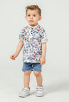 Erkek Bebek Çiçek ve Palmiye Desenli Polo Yaka Keten Tişört ve Kot Şort 2’li Yazlık Takım
